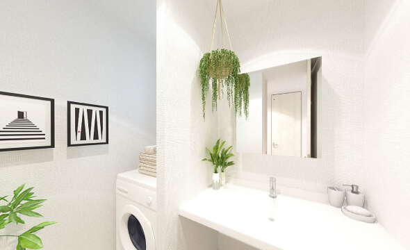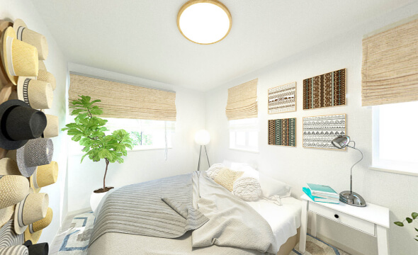 クリーンホワイトやオフホワイトを基調にした、フェミニンな空間。床材や建具を明るい色で統一することで、すべてが一体感を持ちます。生成りの麻やドライフラワーが映える、自然派の生活をイメージしています。テキスタイルから照明まですべて同系色でまとめ、淡いグラデーションを楽しんで。